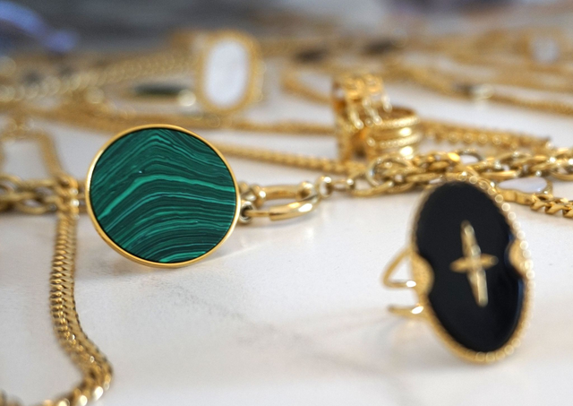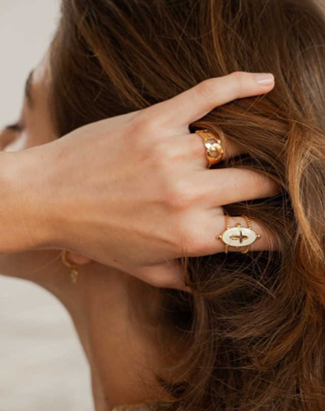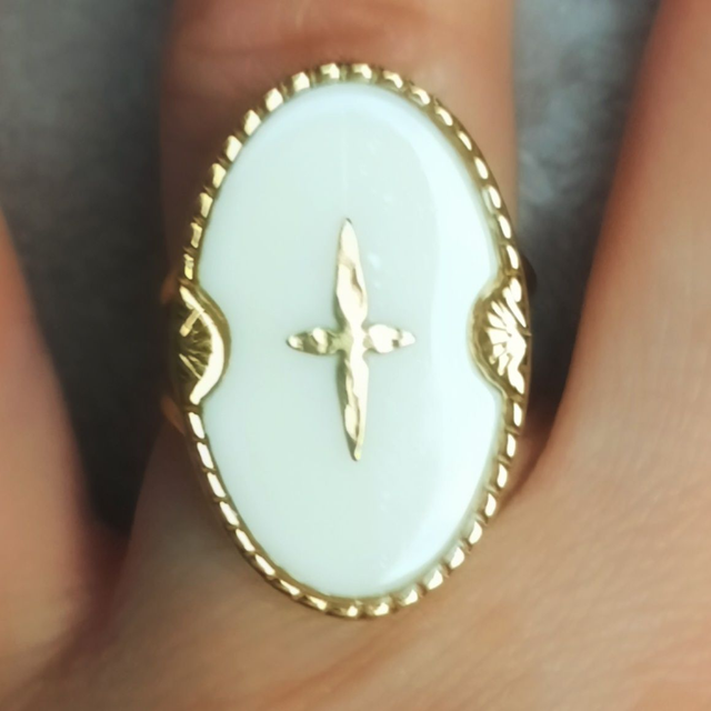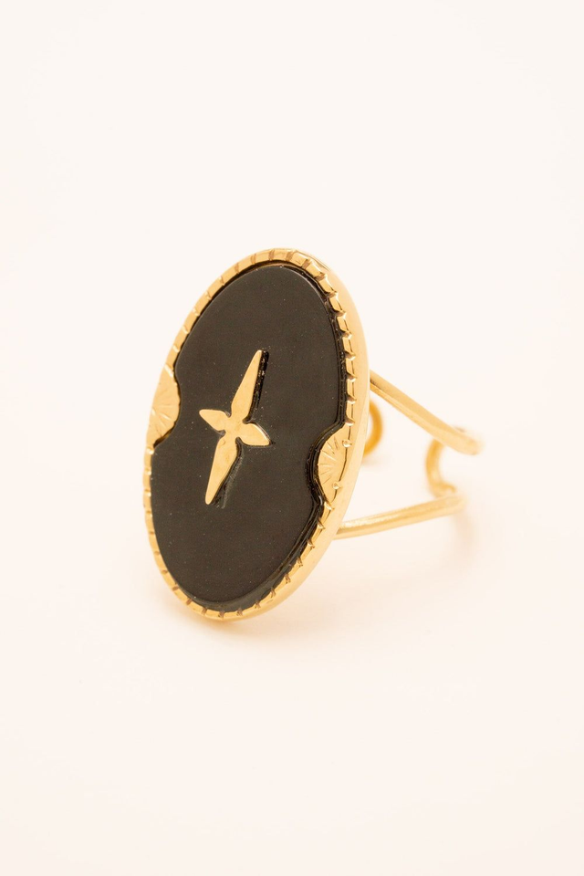 Bague dorée à l'Or Fin composée d'une étoile martelée posée sur un acétate teinté ovale, sertie d'un anneau aux 2 griffes en forme coquillée.