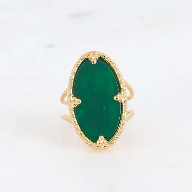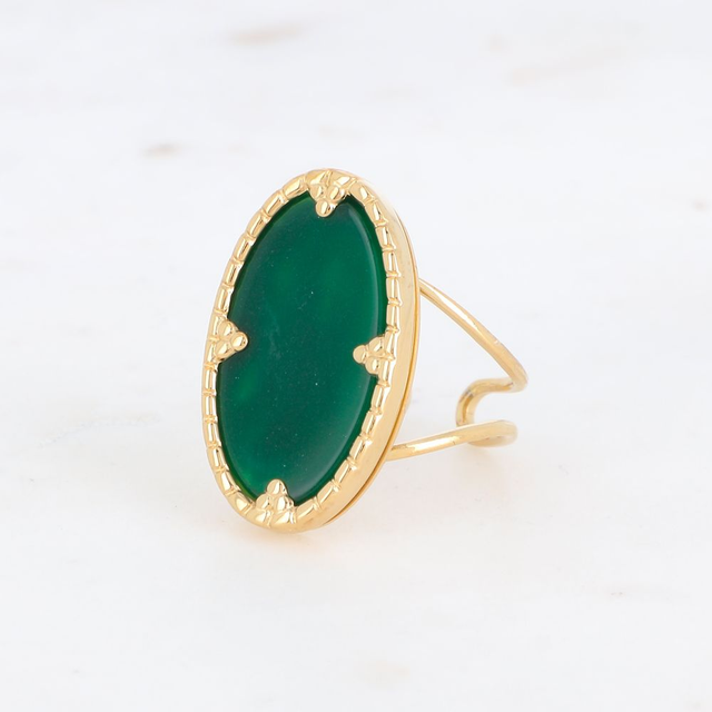 Bague ovale dorée à l'Or fin composée d'une pierre naturelle Agate verte posée sur un anneau aux 4 griffes triangulaires.