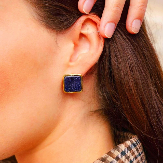 Boucles d'oreilles en acier carré texturé serti d'une pierre naturelle.