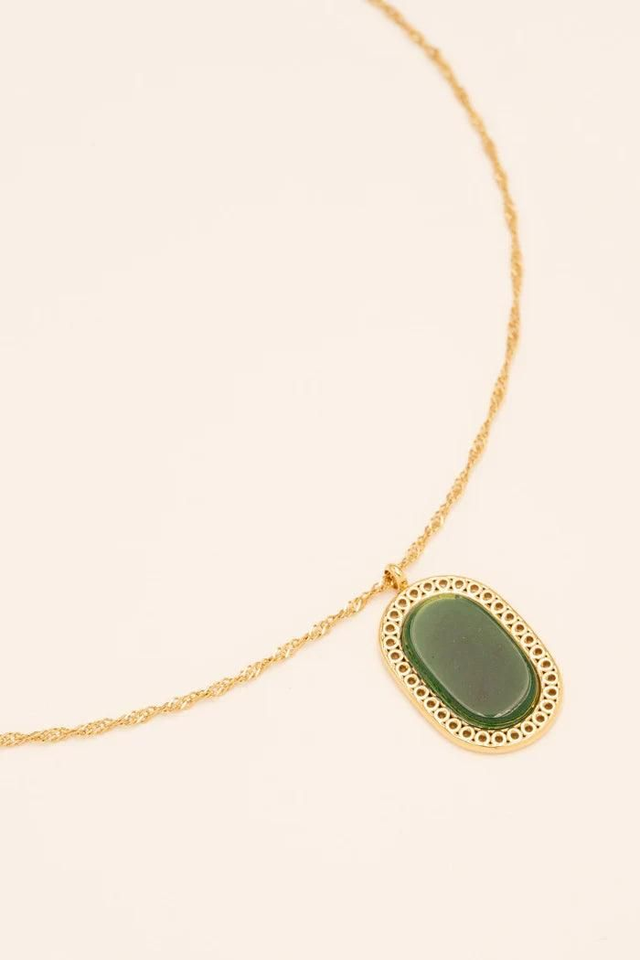 Collier doré à l'Or fin 14 carat serti d'une Pierre naturelle Agate verte ovale posée sur un anneau ajourée.