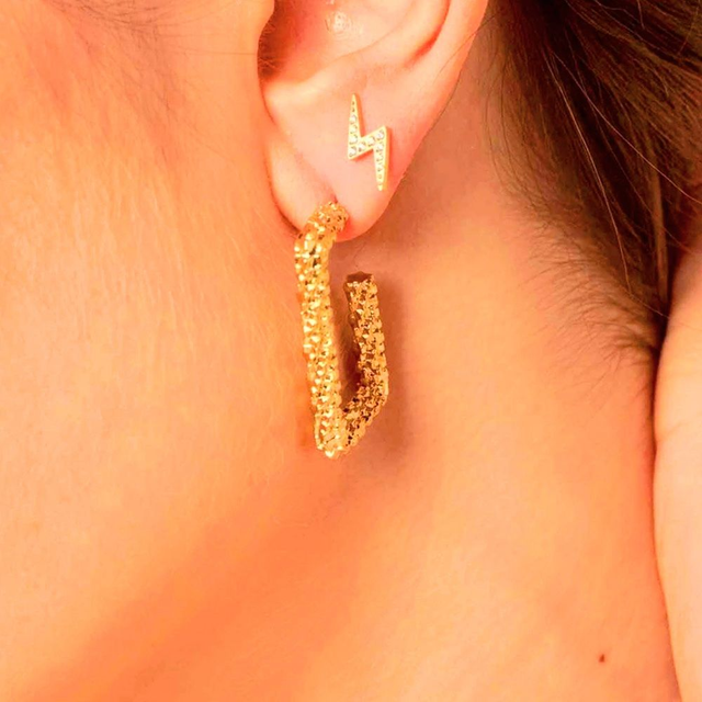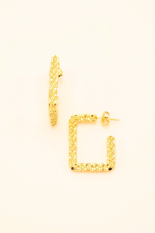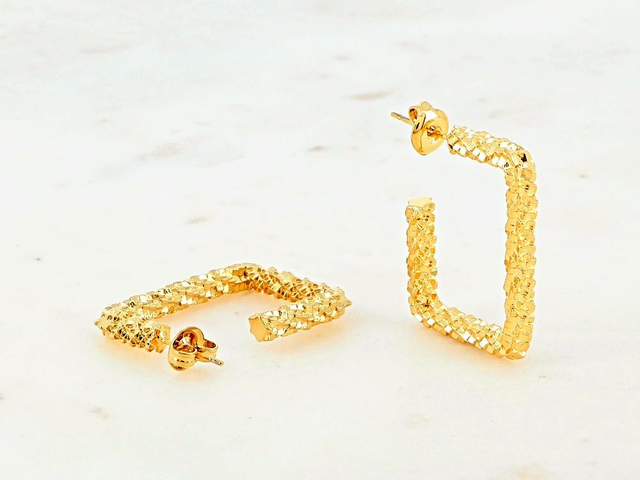 Boucles d'oreilles type créoles en acier en forme de rectangle à l'aspect de mini cubes tressés.