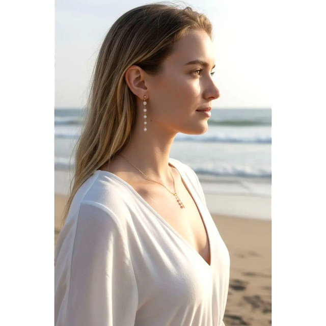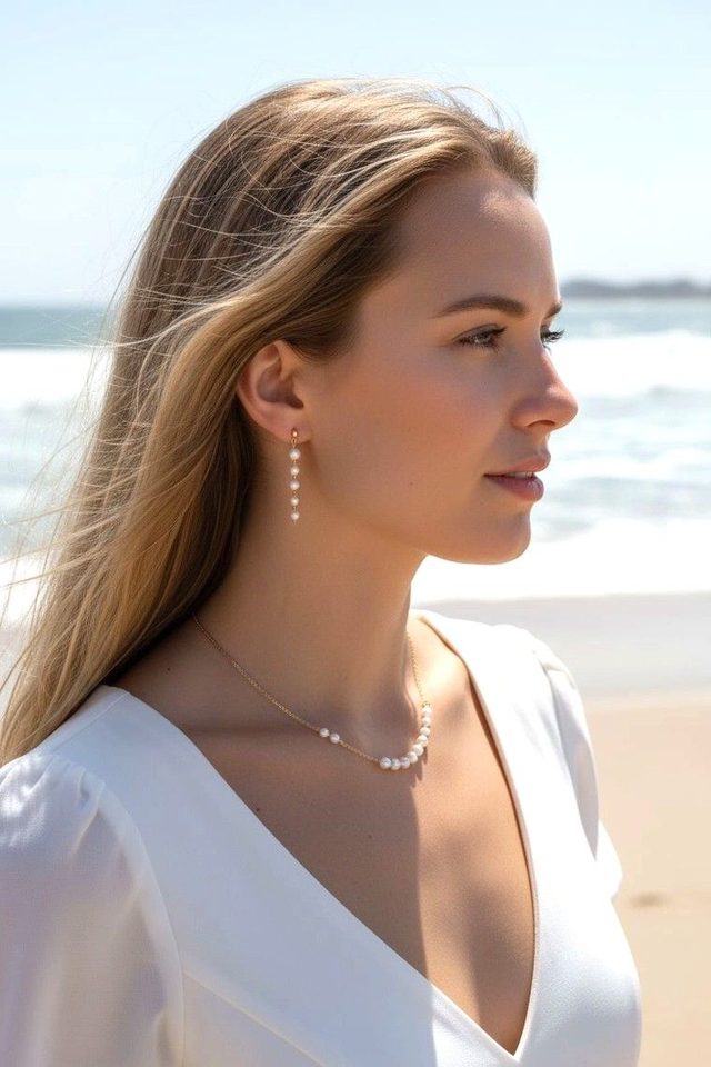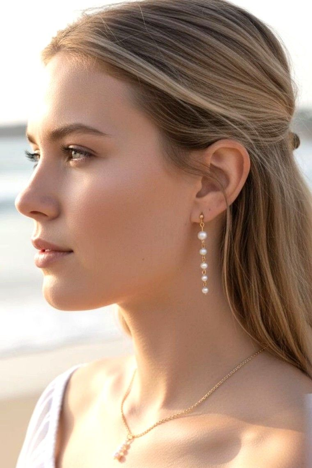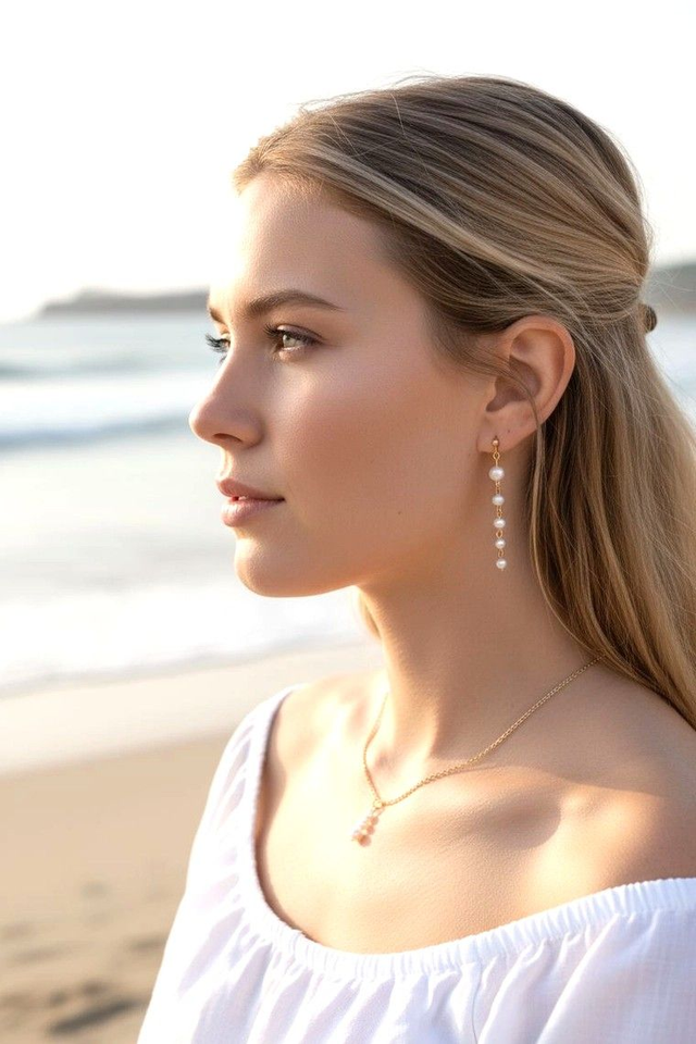 Ces boucles d’oreilles de mariée sont composées de cinq petites perles nacrées soigneusement alignées pour un effet élégant et délicat. Leur design minimaliste apporte une touche raffinée et chic à votre tenue de mariage, idéale pour mettre en valeur un chignon bas ou une coiffure romantique. Chaque paire est confectionnée à la main dans notre atelier avec des apprêts en acier inoxydable, disponibles en version dorée ou argentée, pour un confort optimal tout au long de la journée. - Montage sur crochets d’oreilles pour un tombé plus souple et naturel. Ces boucles s’accordent parfaitement avec nos colliers et peignes assortis, pour composer une parure de mariage harmonieuse et lumineuse. Un bijou intemporel qui complétera avec finesse votre look de mariée bohème, chic ou classique. Longueur portées: 60 mm