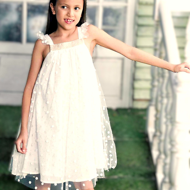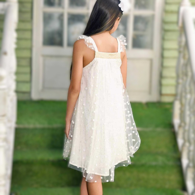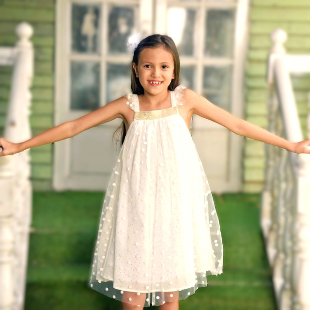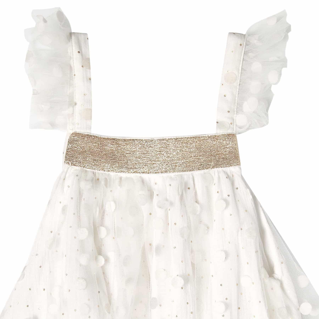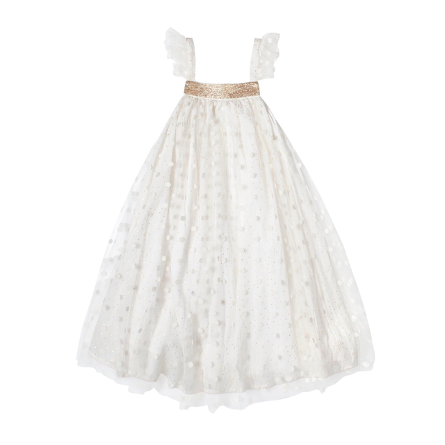 Sa coupe ample et aérienne invite au mouvement, tandis que son tulle ivoire délicatement ponctué de pois et de paillettes dorées capte la lumière à chaque pas.