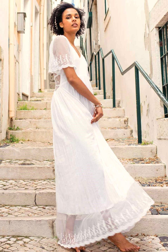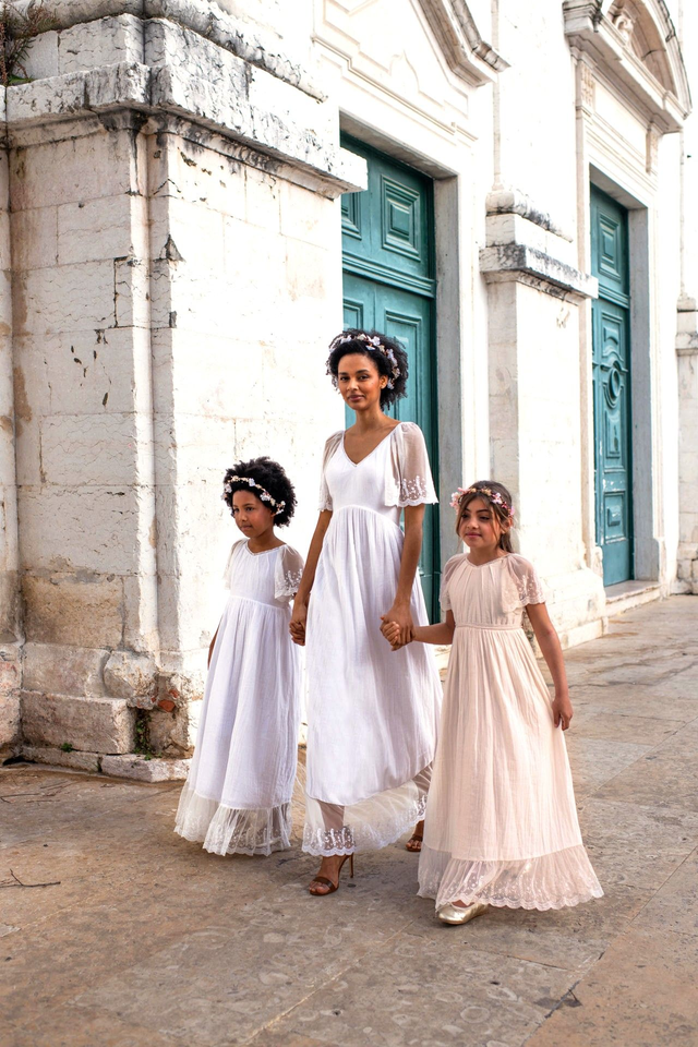 Confectionnée en double gaze de coton et doublée de coton, la robe Salomé séduit par ses broderies fines en nylon et fils de coton.