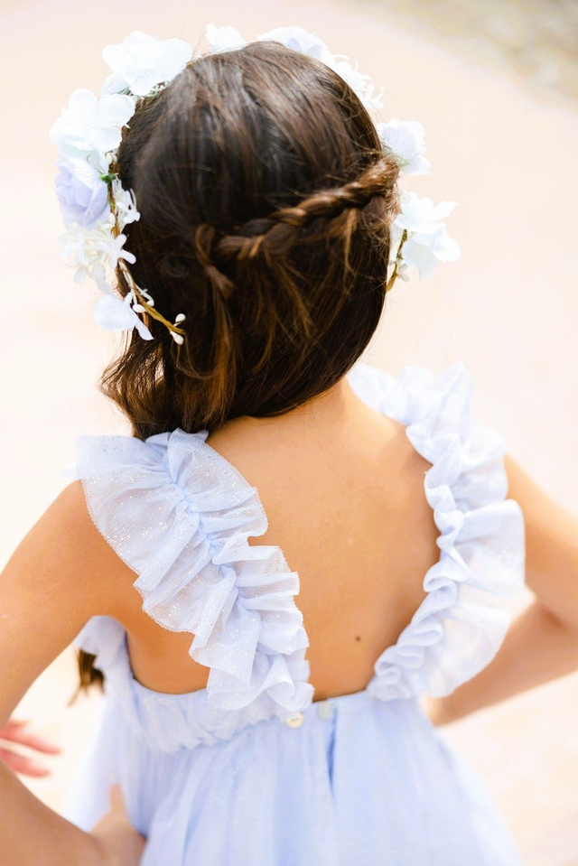 Parmi elles, la robe Scarlett se distingue par son tulle délicat et ses paillettes scintillantes. Elle incarne l'élégance et la grâce, que ce soit pour un mariage, une communion ou bat-mistvah. Dotée de bretelles volantées et d'une jupe volumineuse, cette robe offre une silhouette de danseuse, tout en assurant un confort optimal grâce à sa doublure en popeline de coton et sa taille élastique.